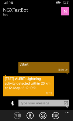 TIP! Multiple users can receive alerts from your lightning detection system by simply adding your alerting bot as outlined in step 1 under Obtaining a Destination ID section and start a chat with it. This of course assumes that your NGX Data server Telegram alerting is already configured and operational.