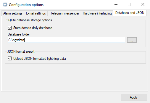 Store data to daily database - If enabled NGX Data Server will save each captured strike event to daily SQLite database archives. A new daily database archive will be created after midnight every day.