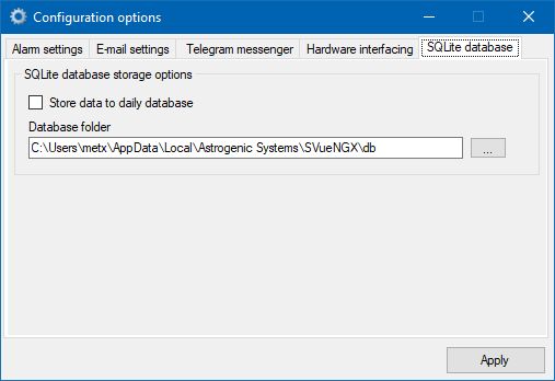 Store data to daily database - If enabled Data Server will save each captured strike event to daily SQLite database archives. A new daily database archive will be created after midnight each day.