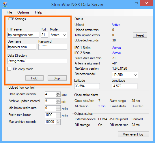 Similar to Hold/Resume above but in this case pressing 'Stop' will close the FTP connection terminate the FTP session. Pressing Start while stopped will reconnect. Note that the Start condition is always overridden by the Idle below strike rate setting.