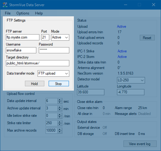 Similar to Hold/Resume above but in this case pressing 'Stop' will close the FTP connection and terminate the FTP session. Pressing Start while stopped will reconnect FTP. Note that the Start condition is always overridden by the Idle below strike rate setting.