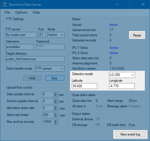 For each lightning strike received from NexStorm, the Data Server will convert the bearing/distance data into geographic coordinates. In order for this conversion to be made correctly you must enter your station location coordinates in Degrees Decimal format in these two fields. The provided coordinates should have a minimum precision of two decimal places, three or four is even better.