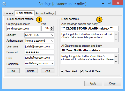 Set up mail server, credentials and alert message recipients. If in doubt, contact your IT support or network administrator to obtain correct settings.