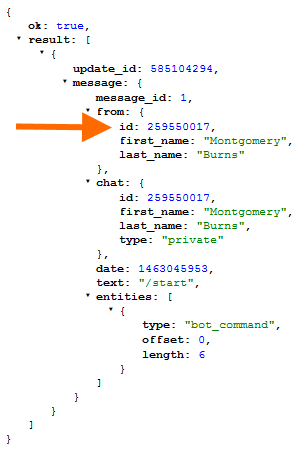 A word of caution: Copying text from web pages may cause invisible non-ASCII characters to be included in the copied text. Destination ID must contain numbers only and neither this nor the Bot token field can contain invisible characters. For this reason it is strongly recommended that you do not copy-paste Destination ID but instead type it in manually. For advanced users you can opt to 'view source' on the JSON formatted web page in your web browser and copy the Destination ID number from the source code.