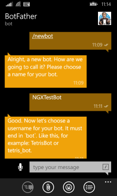 This should make the Telegram app open automatically and initiate a chat with BotFather. Now we need create our bot. In the chat dialog, type: