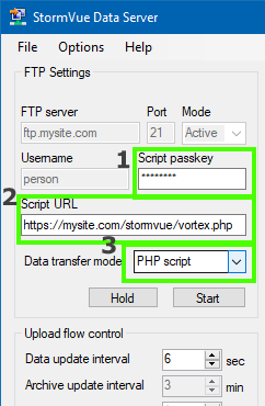 3. Change Data transfer mode to PHP script. Note that all settings not relevant to this specific mode are now disabled. If StormVue Data Server is currently uploading data, click Stop then Start button, otherwise click Start.
